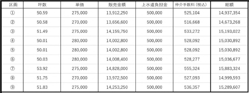 ■敷地面積は、165.34㎡(50.01坪)~178,7㎡(53.92坪)、価格は、13,912,250円~14,828,000円。開放感のある角地の①・⑨号地、南側に遮るものがなく陽当り良好な③~⑦号地など、今ならお好きな区画が選べます。