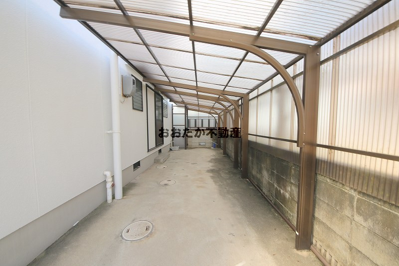 ■駐車場は縦列で2台(車種による)駐車可能です。屋根付きカーポートで、天候不良から大切なお車を守ります。