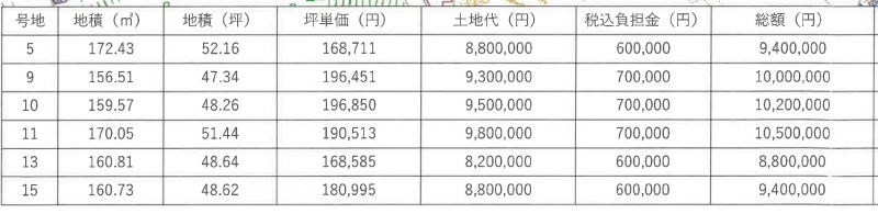 備考 | 建築条件なし、公営水道、プロパンガス、公共下水、ゴミステーション持分1/15あり、現況渡し、税込負担金600,000円(⑤⑬⑮号地)、(⑨⑩⑪号地700,000円)別途要、⑨⑩⑪号地は北側敷地内に境界ブロック3段施工 |