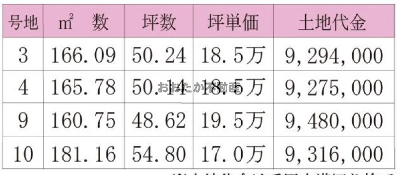 ■他、南隣の④号地 165.78㎡(50.14坪) 18.5万円/坪 927.5万円、南道路に面した⑨号地 160.75㎡(48.62坪) 19.5万円/坪 948万円、10号地 181.16㎡(54.8坪) 17万円/坪 931.6万円 が販売中です。