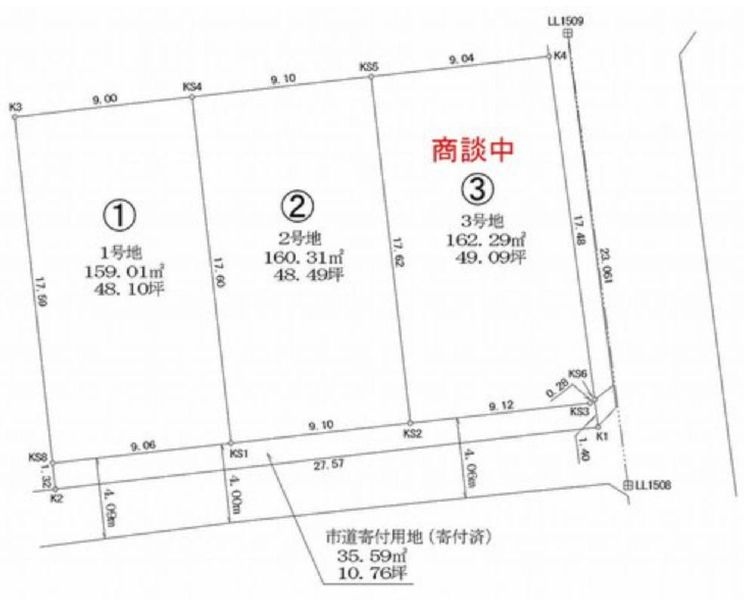 | 備考 | 建築条件なし、公営水道、公共下水、都市ガス、上下水道負担金は販売価格に含む、②号地 160.31㎡(48.49坪) 35.8万円/坪 17,359,420円 もあり、③号地商談中、現況渡し |