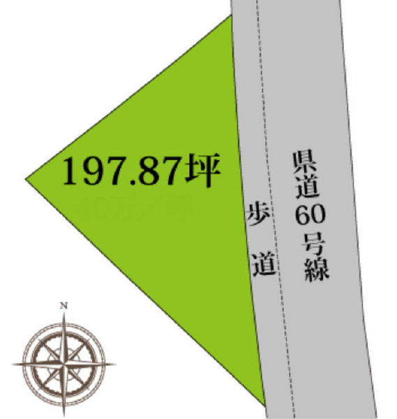 ■交通量の多い県道60号線沿いの一角、まとまった広さ197坪の売土地です。造成工事を行い、地目を宅地に変更してお渡しします。