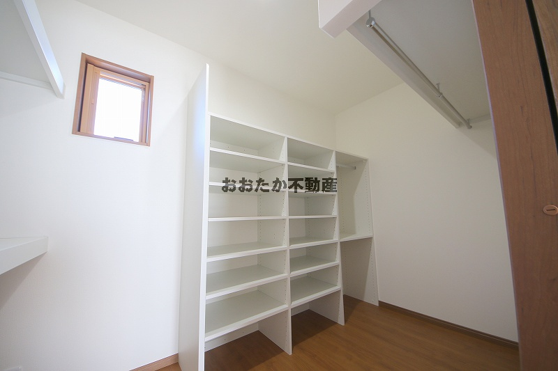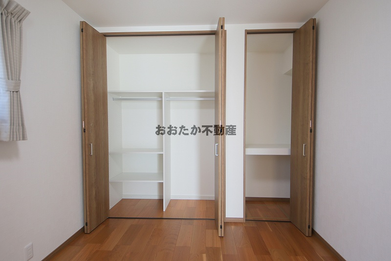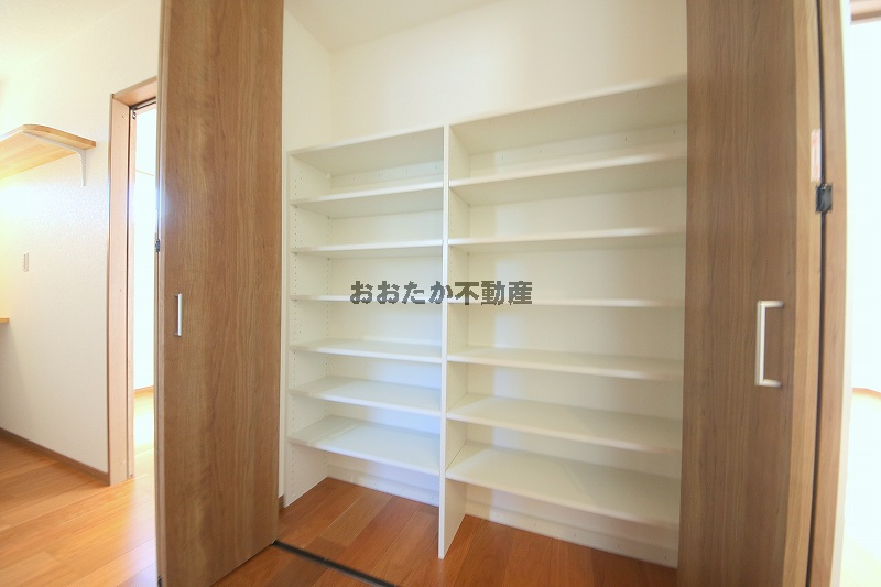 ■1階には、他に独立した5.6帖の洋室があります。備え付けの収納棚は、間仕切りの位置や棚板の移動も自由自在。生活空間をスッキリ整えます。