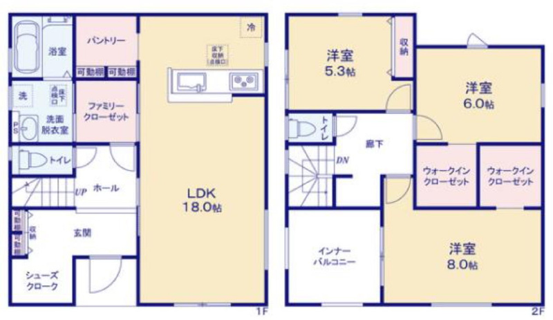 | 間取詳細 | LDK18,FC,パントリー,洋5.3,洋6,洋8,2WIC |