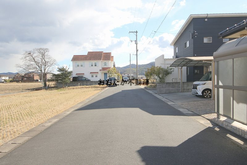 ■東側の接道は、幅員6mでお車の出し入れもスムーズです。駐車場は北側に屋根付きのカーポートが縦列で2台分ありますが、南面の敷地にも複数台駐車が可能です。