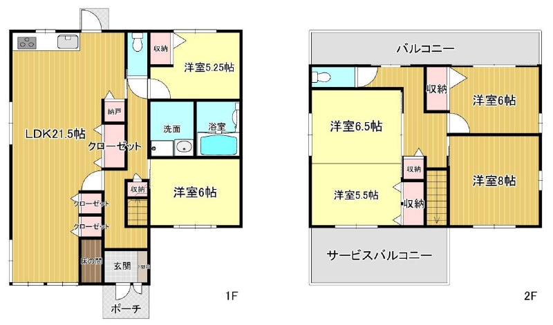 ■2階には、洋室が4部屋(6.5帖、5.5帖、6帖、8帖)。東西側にそれぞれバルコニーがあり、洗濯物や布団を一度にたくさん干すことができますね。