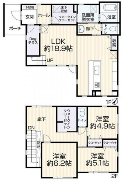 ■間取りは、各階にウォークインクローゼットを備えた3LDK。1階のLDKは、南向きで明るく、18.9帖と広々した空間。リビングには、ドッグテラスがあり、大好きなペットもお家の中で暮らせます♪