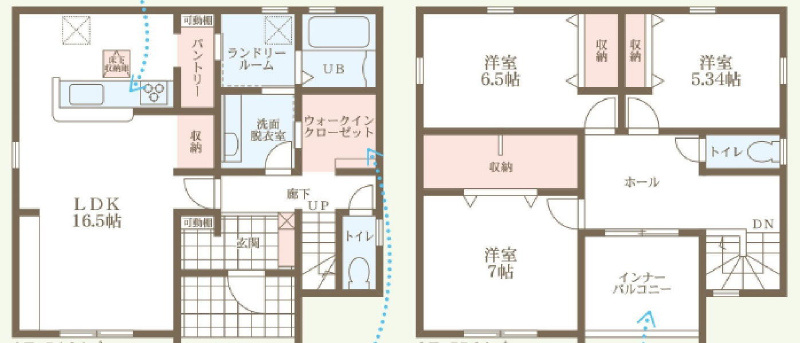 ■1階には、衣類以外にも季節家電や調度品など背の高い荷物もスッキリしまうことができるウォークインクローゼットを配置。16帖のLDKには、配膳や片付けも楽々♪♪のカウンターキッチン。南向きの明るい空間で自然と家族が集まります。パントリーからランドリールームへと水回りの動線が短く、家事がはかどりますね。