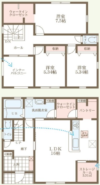 ■1階には、南向きで明るい16帖のLDK。家族と会話を楽しみながらお料理が作れる対面式のカウンターキッチン。キッチン→パントリー→WIC→洗面・浴室→玄関→LDKと周遊できる2WAY動線で、家事がはかどりますね。
