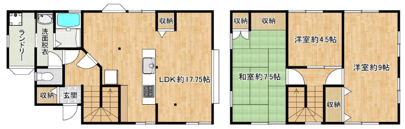 ■2階には、7.5帖の和室と洋室が2部屋(4.5帖,9帖)。お子様も個室で、集中して勉強ができますね。