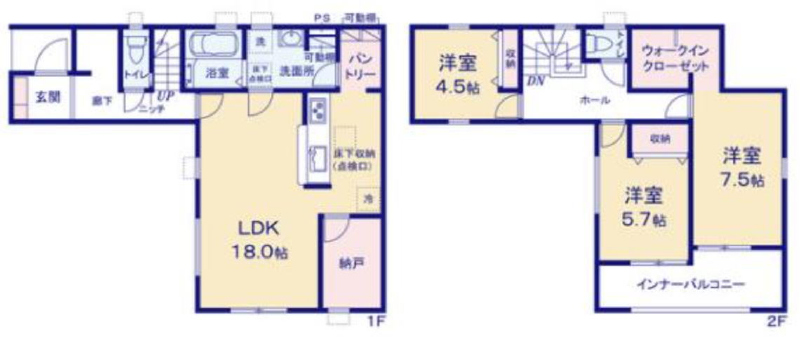 ■敷地は、西側が道路に面した49坪。間取りは、子育てファミリーが使いやすい3LDK。全居室に収納を配置。キッチンにはパントリー、主寝室にはウォークインクローゼット、1階には季節家電やアウトドア用品の収納に便利な納戸もあり、生活空間をすっきり整えます。