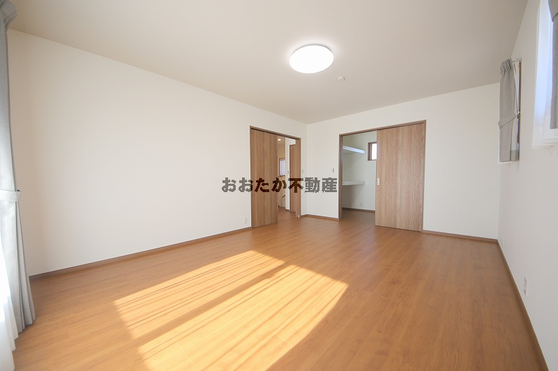 ■家族がコミュニケーションを取りやすいリビング階段を上がると、2階には洋室が4部屋。。11帖の主寝室にはウォークインクローゼット、他3室にも専用の仕切棚とハンガーパイプが付いたクローゼットを装備しています。部屋数が多いので、生活スタイルに合わせて納戸にするもよし、趣味の部屋や書斎としてもGood!!
