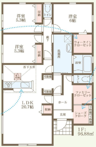 ■キッチンの奥(北側)には洋室が3部屋。6帖の主寝室にはウォークインクローゼット完備。5.3帖の洋室2部屋にはそれぞれ棚付きのクローゼットを設置。
